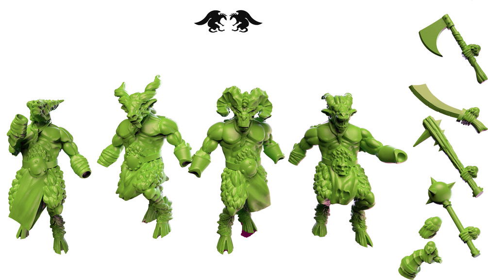 This modular goatman army made by Magori Miniatures. You can check the actual content at www.patreon.com/magoriminiatures. The set contains: